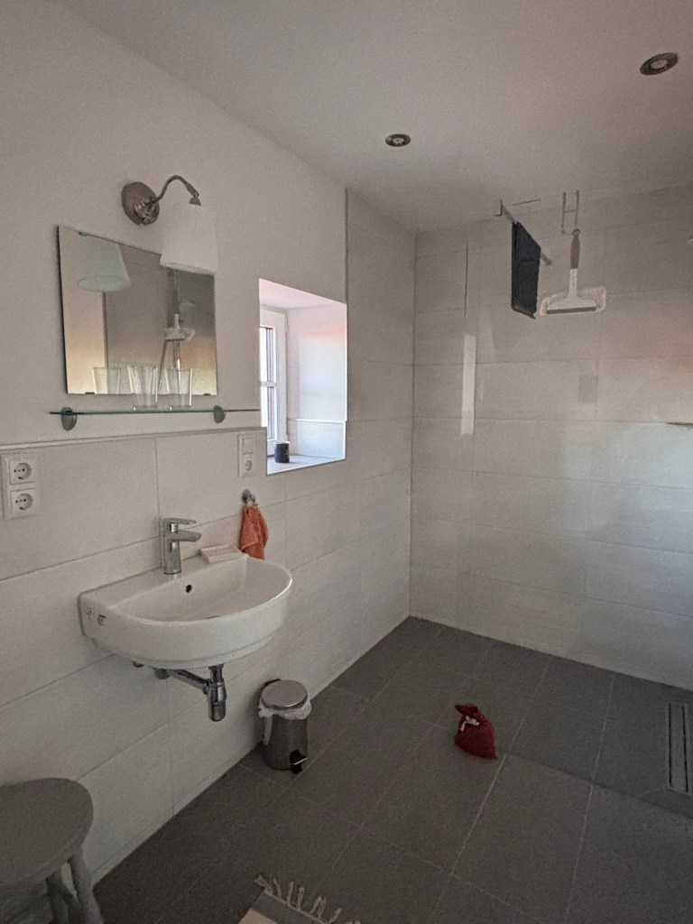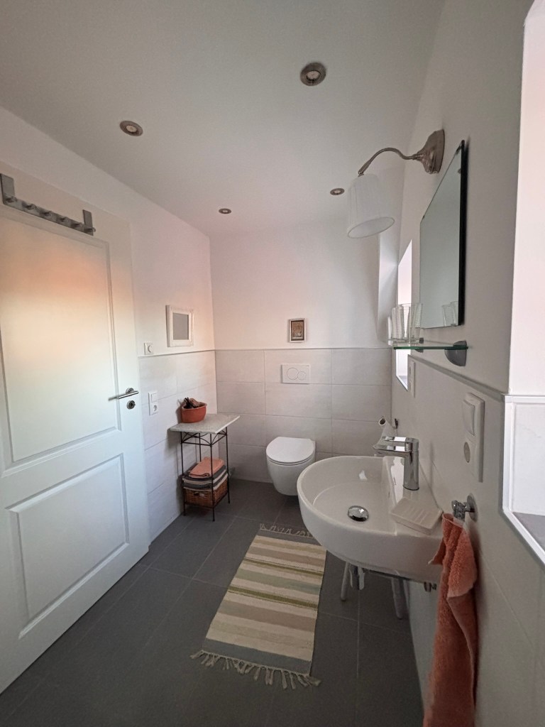 Das Bad bietet Ihnen eine ebenerdige Dusche neben WC und Waschtisch.